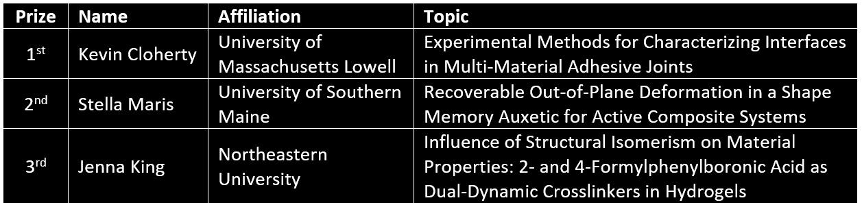 A dozen students from our local student chapters (University of Massachusetts Lowell, University of Southern Maine, & Northeastern University) took part in a Posters Session sponsored by the SAMPE Boston Chapter Diamond Sponsors, Boston Materials & Textron Systems. A wide range of research projects were presented from PEEK polymer processing impacts on crystallinity, to adhesion studies for glass-ceramic materials, to additive manufacturing projects, to piezoelectric foams. It was apparent to all involved that the state of the engineering curriculum and hands on engineering training in each these schools is very strong. While the competition was tough, the winners of the project awards were: